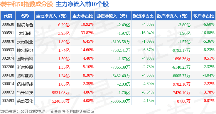 资金流向方面,碳中和50(980021)指数成份股当日主力资金净流入合计3.42亿元,游资资金净流出合计11.97亿元,散户资金净流入合计8.55亿元。成份股资金流向详情见下表: