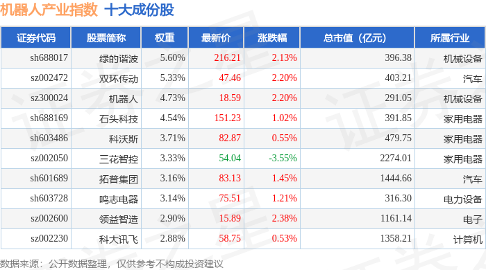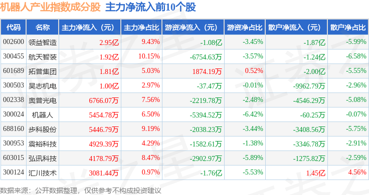 资金流向方面,机器人产业(980022)指数成份股当日主力资金净流出合计18.37亿元,游资资金净流出合计3.2亿元,散户资金净流入合计21.63亿元。成份股资金流向详情见下表: