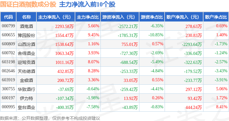 资金流向方面,国证白酒(980031)指数成份股当日主力资金净流出合计5.51亿元,游资资金净流入合计1.91亿元,散户资金净流入合计3.6亿元。成份股资金流向详情见下表: