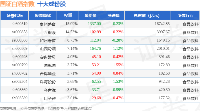 证券之星消息,1月23日,国证白酒(980031)指数报收于62352.16点,跌0.05%,成交173.42亿元,换手率0.95%。当日该指数成份股中,上涨的有15家,酒鬼酒以1.55%的涨幅领涨,下跌的有10家,中粮科技以2.59%的跌幅领跌。
