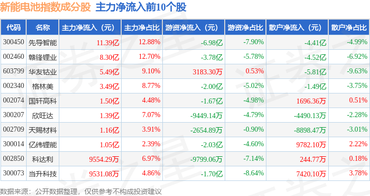 资金流向方面,新能电池(980032)指数成份股当日主力资金净流出合计13.02亿元,游资资金净流出合计14.8亿元,散户资金净流入合计28.08亿元。成份股资金流向详情见下表:
