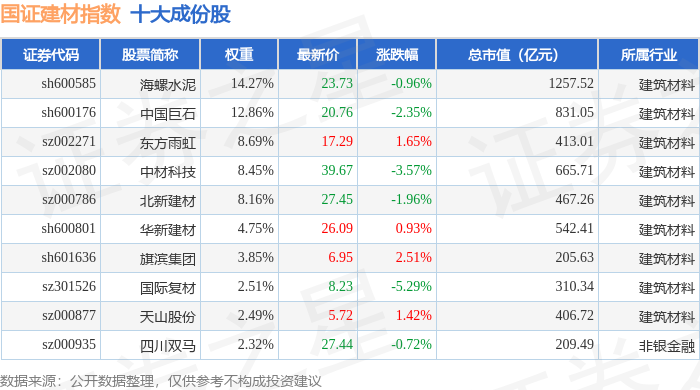 证券之星消息,1月23日,国证建材(980048)指数报收于5574.82点,跌0.3%,成交222.09亿元,换手率3.79%。当日该指数成份股中,上涨的有18家,金晶科技以10.05%的涨幅领涨,下跌的有12家,国际复材以5.29%的跌幅领跌。