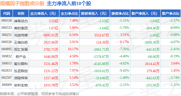 资金流向方面,规模因子(980055)指数成份股当日主力资金净流出合计7.58亿元,游资资金净流出合计2.97亿元,散户资金净流入合计10.55亿元。成份股资金流向详情见下表: