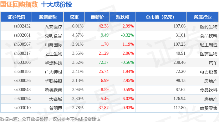 证券之星消息,1月23日,国证回购(980063)指数报收于3683.11点,涨1.36%,成交602.55亿元,换手率1.45%。当日该指数成份股中,上涨的有34家,明阳智能以10.01%的涨幅领涨,下跌的有15家,妙可蓝多以3.34%的跌幅领跌。