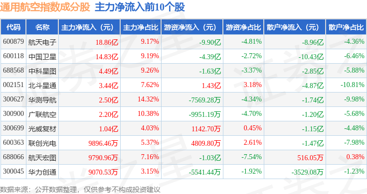 资金流向方面,通用航空(980076)指数成份股当日主力资金净流入合计49.86亿元,游资资金净流出合计21.98亿元,散户资金净流出合计27.88亿元。成份股资金流向详情见下表: