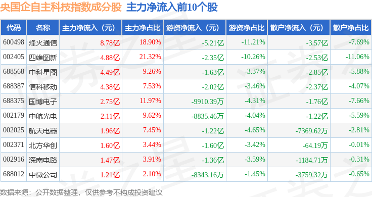 资金流向方面,央国企自主科技(980083)指数成份股当日主力资金净流出合计29.32亿元,游资资金净流入合计4.73亿元,散户资金净流入合计24.6亿元。成份股资金流向详情见下表: