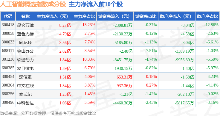 资金流向方面,人工智能精选(980087)指数成份股当日主力资金净流出合计64.44亿元,游资资金净流入合计46.49亿元,散户资金净流入合计17.3亿元。成份股资金流向详情见下表: