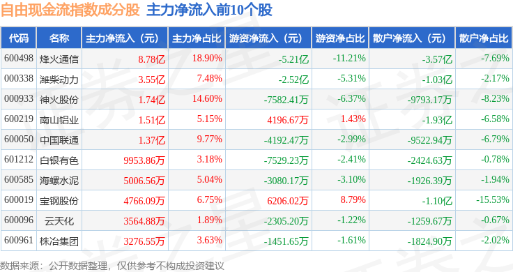 资金流向方面,自由现金流(980092)指数成份股当日主力资金净流出合计13.57亿元,游资资金净流入合计6155.61万元,散户资金净流入合计12.96亿元。成份股资金流向详情见下表: