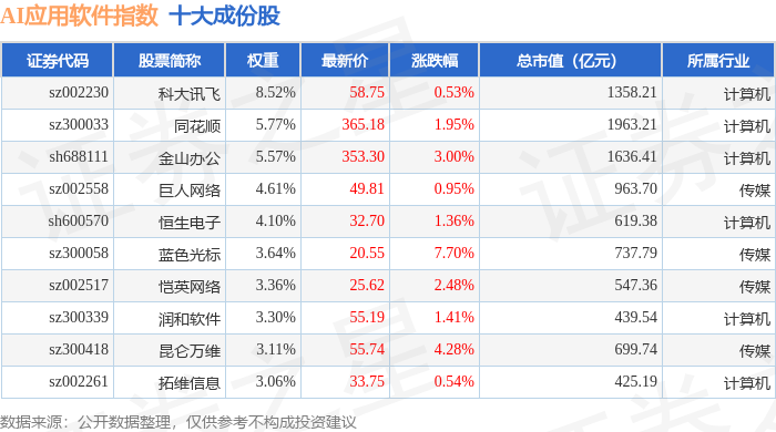 AI应用软件(980107)指数十大成份股详情如下: