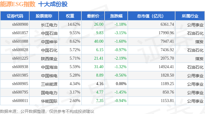 能源ESG(980133)指数十大成份股详情如下:
