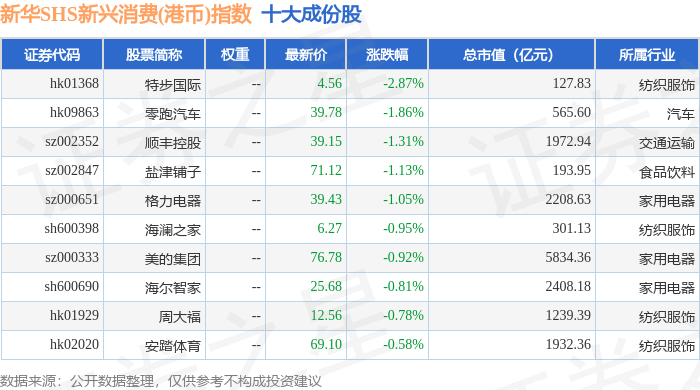 新华SHS新兴消费(港币)(989007)指数十大成份股详情如下: