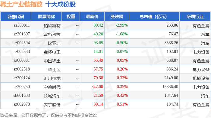 证券之星消息,1月23日,稀土产业链(989013)指数报收于4034.79点,涨2.71%,成交1162.16亿元,换手率3.9%。当日该指数成份股中,上涨的有46家,拉普拉斯以20.01%的涨幅领涨,下跌的有4家,铂科新材以2.99%的跌幅领跌。