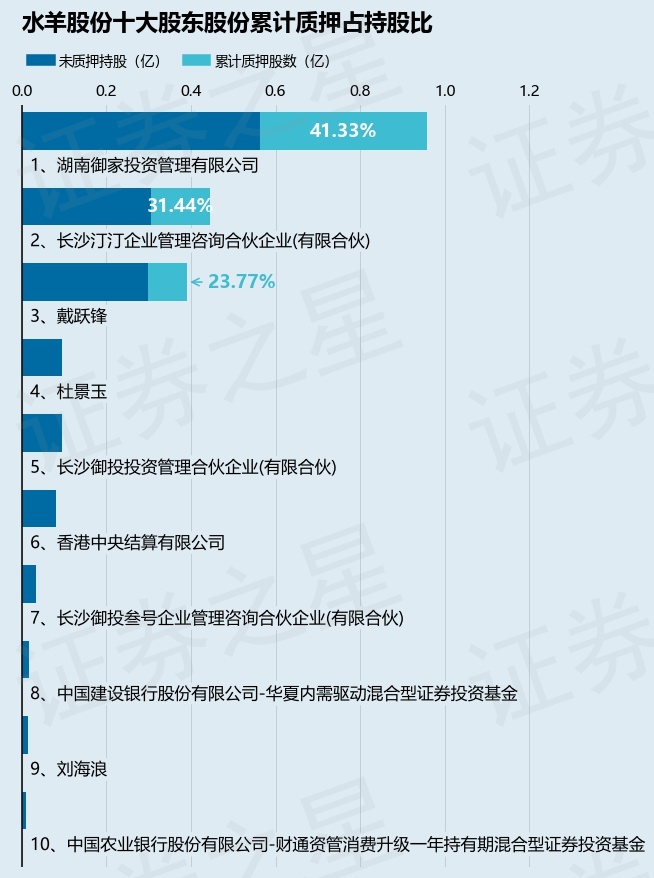 截止本公告日,股东湖南御家投资管理有限公司已累计质押股份3964.0万股,占其持股总数的41.33%,股东长沙汀汀企业管理咨询合伙企业(有限合伙)已累计质押股份1400.0万股,占其持股总数的31.44%,股东戴跃锋已累计质押股份929.0万股,占其持股总数的23.77%。本次质押后水羊股份十大股东的累计质押股份占持股比例(占持股比例的计算以公司最新一期财务报表公布的十大股东的持股总数为基准)见下图: