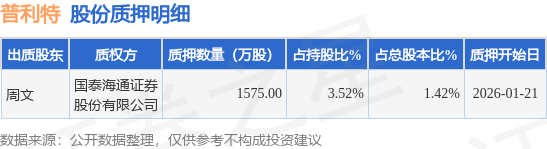 证券之星消息,普利特(002324)1月23日公开信息显示,股东周文向国泰海通证券股份有限公司合计质押1575.0万股,占总股本1.42%。质押详情见下表: