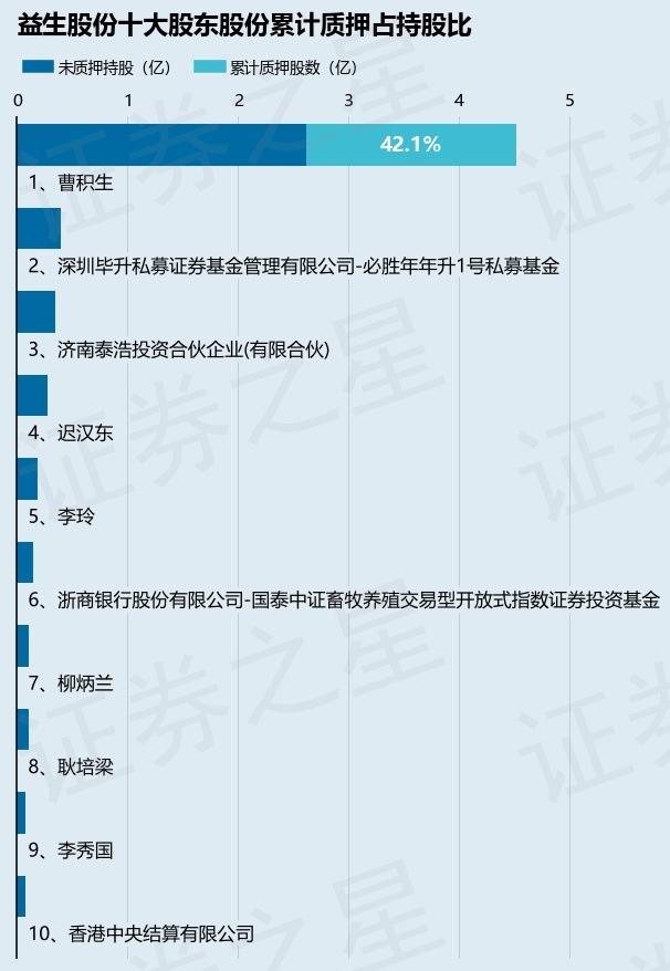 截止本公告日,股东曹积生已累计质押股份1.9亿股,占其持股总数的42.1%。本次质押后益生股份十大股东的累计质押股份占持股比例(占持股比例的计算以公司最新一期财务报表公布的十大股东的持股总数为基准)见下图: