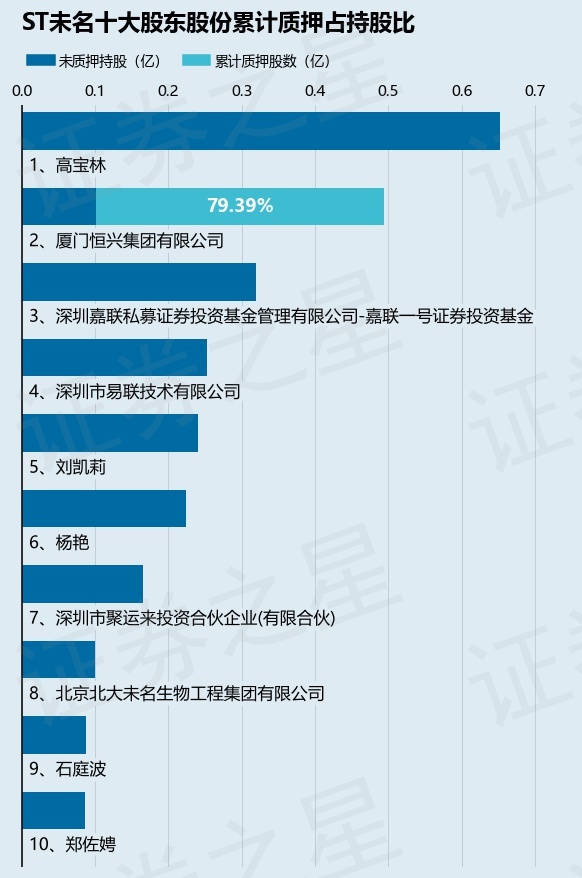 截止本公告日,股东厦门恒兴集团有限公司已累计质押股份3922.0万股,占其持股总数的79.39%。本次质押后ST未名十大股东的累计质押股份占持股比例(占持股比例的计算以公司最新一期财务报表公布的十大股东的持股总数为基准)见下图: