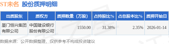 证券之星消息,ST未名(002581)1月23日公开信息显示,股东厦门恒兴集团有限公司向中国建设银行股份有限公司合计质押1550.0万股,占总股本2.35%。质押详情见下表: