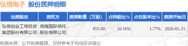 证券之星消息,弘信电子(300657)1月23日公开信息显示,股东弘信创业工场投资集团股份有限公司向渤海国际信托股份有限公司合计质押855.0万股,占总股本1.77%。质押详情见下表: