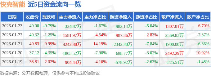 证券之星消息,截至2026年1月23日收盘,快克智能(603203)报收于40.0元,下跌0.79%,换手率1.95%,成交量4.85万手,成交额1.95亿元。