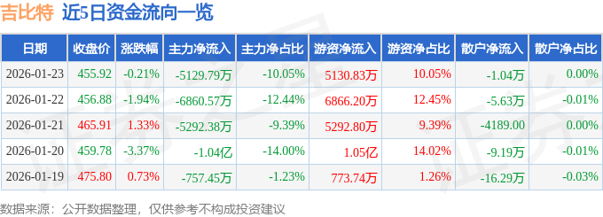1月23日的资金流向数据方面,主力资金净流出5129.79万元,占总成交额10.05%,游资资金净流入5130.83万元,占总成交额10.05%,散户资金净流出1.04万元。