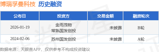 证券之星消息,根据天眼查APP于1月19日公布的信息整理,博瑞孚曼机械科技(苏州)有限公司B轮融资,融资额未披露,参与投资的机构包括金雨茂物,常熟国发创投。