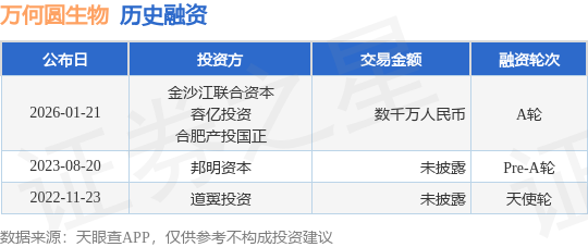 证券之星消息,根据天眼查APP于1月21日公布的信息整理,上海万何圆生物科技有限公司A轮融资,融资额数千万人民币,参与投资的机构包括金沙江联合资本,容亿投资,合肥产投国正。