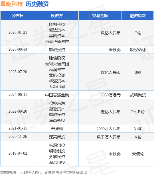 证券之星消息,根据天眼查APP于1月21日公布的信息整理,深圳量旋科技有限公司C轮融资,融资额数亿人民币,参与投资的机构包括隆利科技,毅达资本,晶凯资本,恒泰华盛资产。