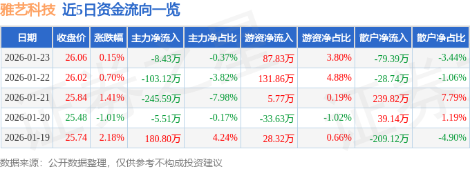 证券之星消息,截至2026年1月23日收盘,雅艺科技(301113)报收于26.06元,上涨0.15%,换手率1.61%,成交量8895.0手,成交额2308.55万元。