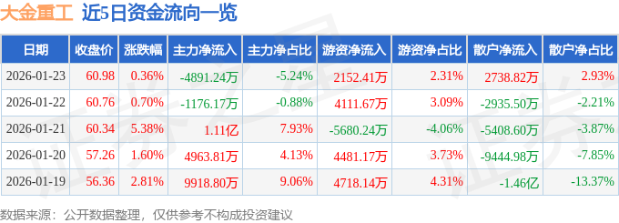 证券之星消息,截至2026年1月23日收盘,大金重工(002487)报收于60.98元,上涨0.36%,换手率2.42%,成交量15.25万手,成交额9.33亿元。