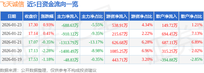 证券之星消息,截至2026年1月23日收盘,飞天诚信(300386)报收于17.3元,上涨0.93%,换手率2.87%,成交量7.2万手,成交额1.24亿元。