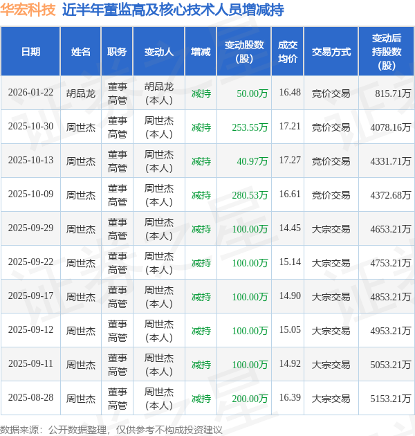 华宏科技近半年内的董监高及核心技术人员增减持详情如下: