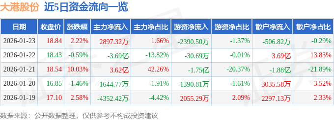 证券之星消息,截至2026年1月23日收盘,大港股份(002077)报收于18.84元,上涨2.22%,换手率16.12%,成交量93.58万手,成交额17.43亿元。