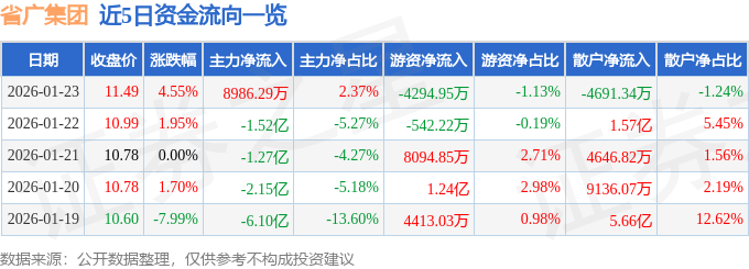 证券之星消息,截至2026年1月23日收盘,省广集团(002400)报收于11.49元,上涨4.55%,换手率19.28%,成交量332.82万手,成交额37.96亿元。