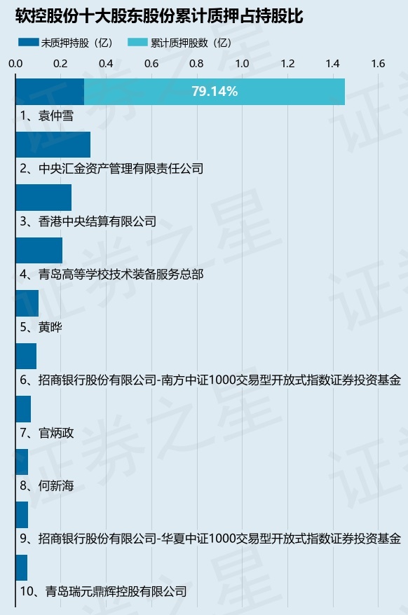 截止本公告日,股东袁仲雪已累计质押股份1.15亿股,占其持股总数的79.14%。本次质押后软控股份十大股东的累计质押股份占持股比例(占持股比例的计算以公司最新一期财务报表公布的十大股东的持股总数为基准)见下图: