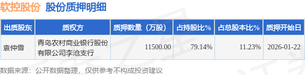 证券之星消息,软控股份(002073)1月24日公开信息显示,股东袁仲雪向青岛农村商业银行股份有限公司李沧支行合计质押1.15亿股,占总股本11.23%。质押详情见下表: