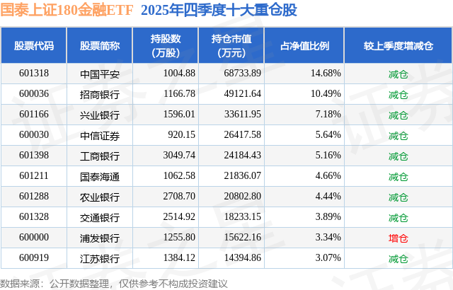 国泰上证180金融ETF基金成立于2011年3月31日,基金经理为艾小军,基金跟踪标的为上证180金融股指数,成立以来超额回报为78.21%,近一个月超额回报为0.44%。最新披露的基金持仓数据显示,截止2025年12月31日,该基金第一大重仓股为中国平安(601318),持股占比为14.68%。