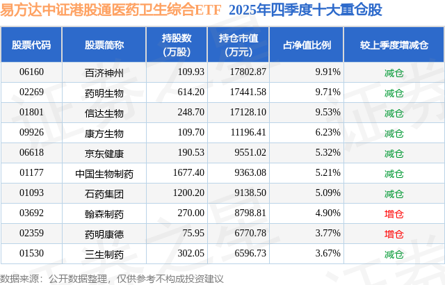 易方达中证港股通医药卫生综合ETF基金成立于2022年1月19日,基金经理为伍臣东,基金跟踪标的为中证港股通医药卫生综合港元指数,成立以来超额回报为14.92%,近一个月超额回报为-0.55%。最新披露的基金持仓数据显示,截止2025年12月31日,该基金第一大重仓股为百济神州(06160),持股占比为9.91%。