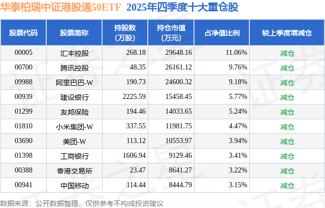 华泰柏瑞中证港股通50ETF基金成立于2020年12月30日,基金经理为李茜,基金跟踪标的为中证港股通50港元指数,成立以来超额回报为-16.88%,近一个月超额回报为-1.06%。最新披露的基金持仓数据显示,截止2025年12月31日,该基金第一大重仓股为汇丰控股(00005),持股占比为11.06%。