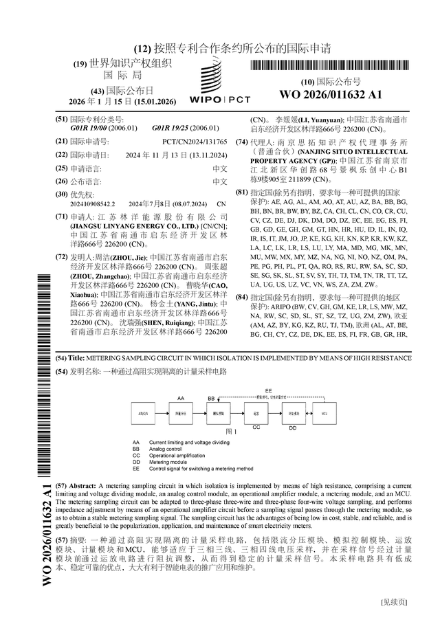 证券之星消息,根据企查查数据显示林洋能源(601222)公布了一项国际专利申请,专利名为“一种通过高阻实现隔离的计量采样电路”,专利申请号为PCT/CN2024/131765,国际公布日为2026年1月15日。