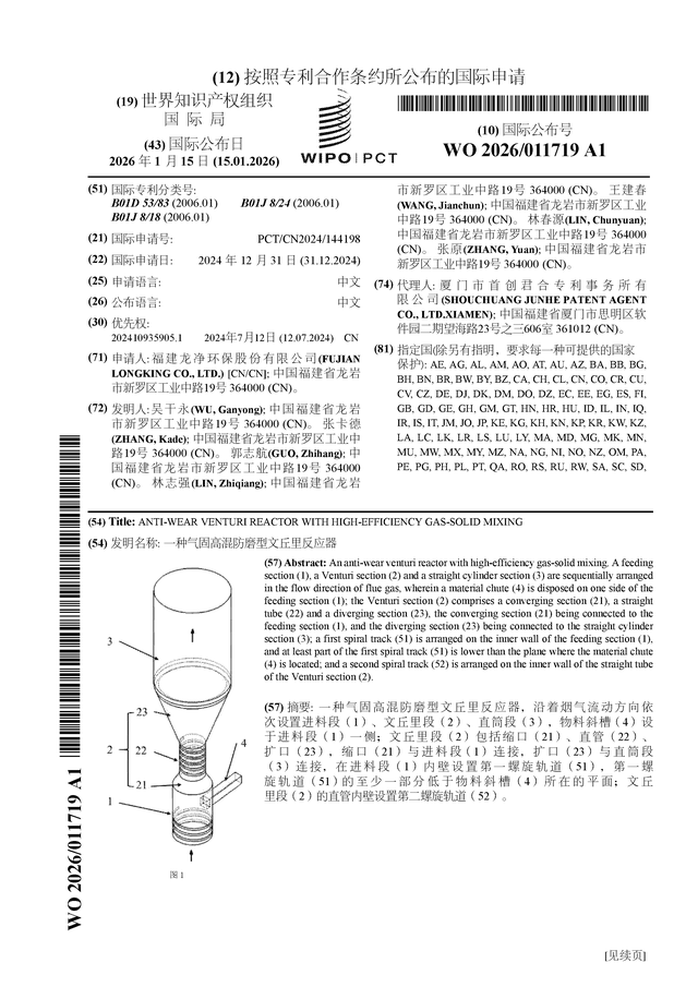 证券之星消息,根据企查查数据显示龙净环保(600388)公布了一项国际专利申请,专利名为“一种气固高混防磨型文丘里反应器”,专利申请号为PCT/CN2024/144198,国际公布日为2026年1月15日。