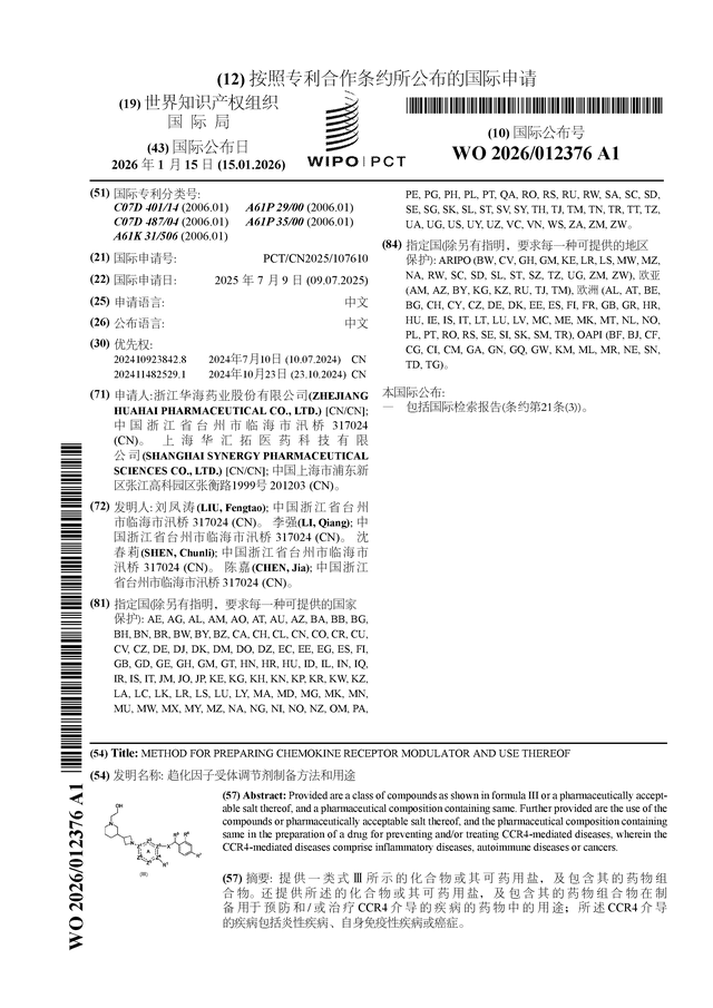 证券之星消息,根据企查查数据显示华海药业(600521)公布了一项国际专利申请,专利名为“趋化因子受体调节剂制备方法和用途”,专利申请号为PCT/CN2025/107610,国际公布日为2026年1月15日。