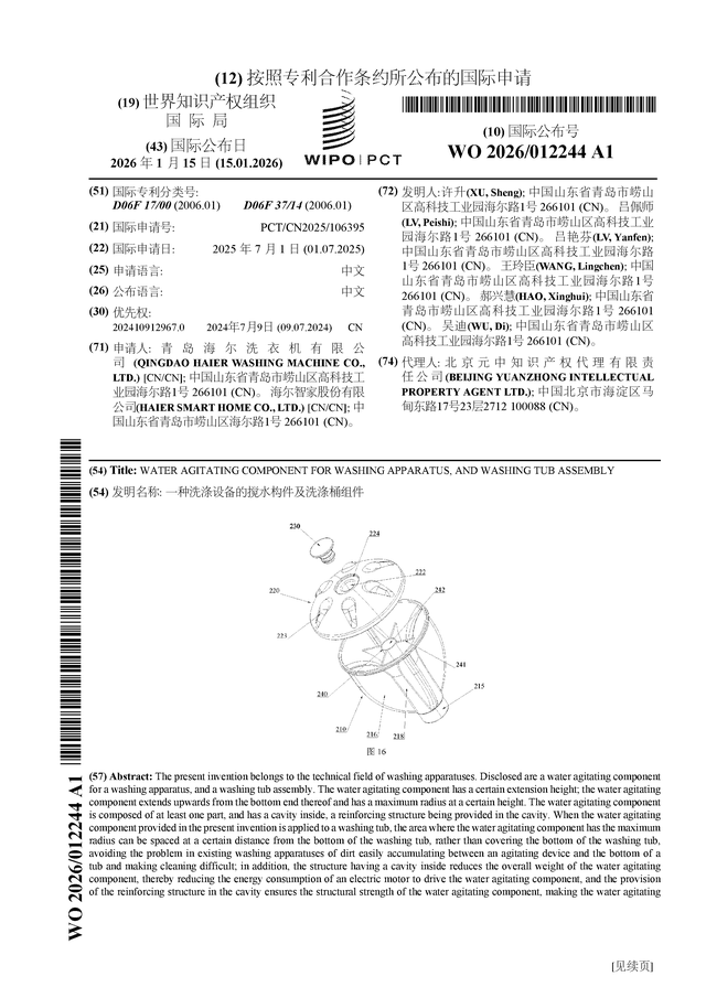 证券之星消息,根据企查查数据显示海尔智家(600690)公布了一项国际专利申请,专利名为“一种洗涤设备的搅水构件及洗涤桶组件”,专利申请号为PCT/CN2025/106395,国际公布日为2026年1月15日。
