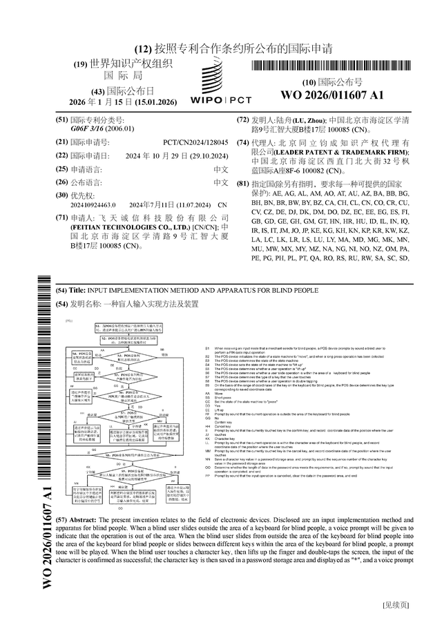证券之星消息,根据企查查数据显示飞天诚信(300386)公布了一项国际专利申请,专利名为“一种盲人输入实现方法及装置”,专利申请号为PCT/CN2024/128045,国际公布日为2026年1月15日。