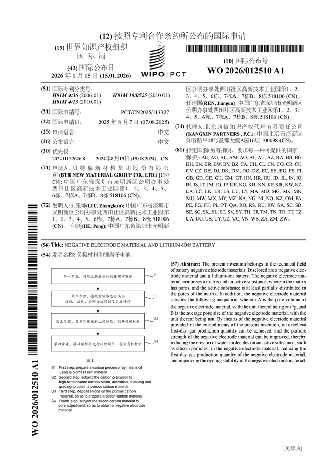 证券之星消息,根据企查查数据显示贝特瑞(920185)公布了一项国际专利申请,专利名为“负极材料和锂离子电池”,专利申请号为PCT/CN2025/113327,国际公布日为2026年1月15日。