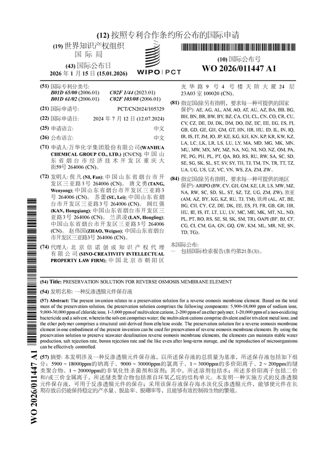 证券之星消息,根据企查查数据显示万华化学(600309)公布了一项国际专利申请,专利名为“一种反渗透膜元件保存液”,专利申请号为PCT/CN2024/105329,国际公布日为2026年1月15日。