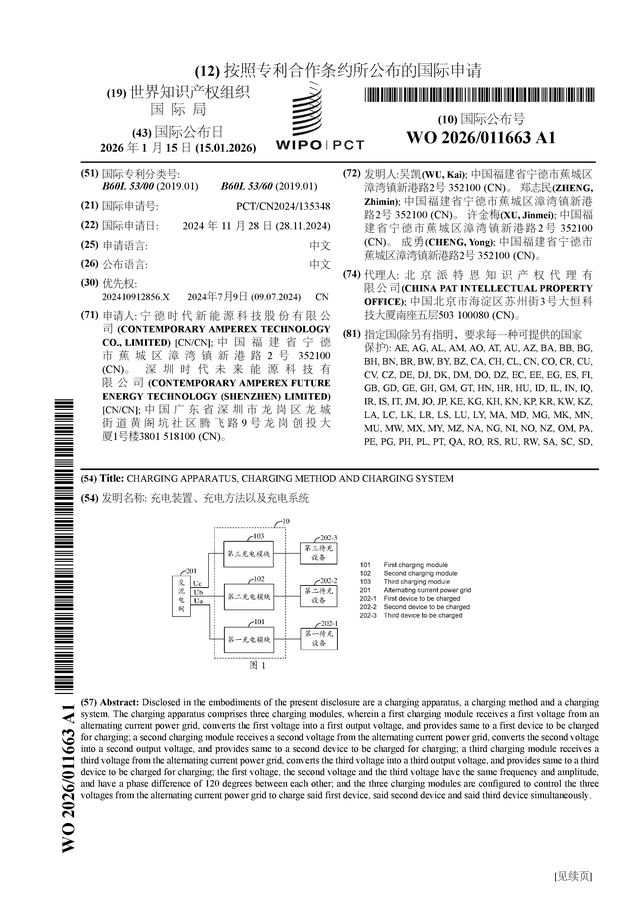 证券之星消息,根据企查查数据显示宁德时代(300750)公布了一项国际专利申请,专利名为“充电装置、充电方法以及充电系统”,专利申请号为PCT/CN2024/135348,国际公布日为2026年1月15日。