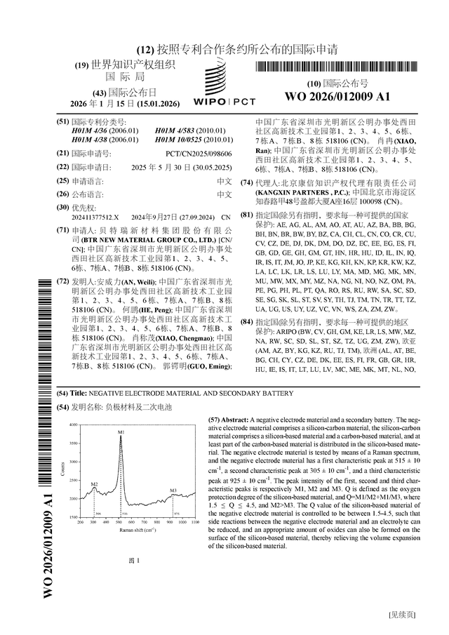 证券之星消息,根据企查查数据显示贝特瑞(920185)公布了一项国际专利申请,专利名为“负极材料及二次电池”,专利申请号为PCT/CN2025/098606,国际公布日为2026年1月15日。
