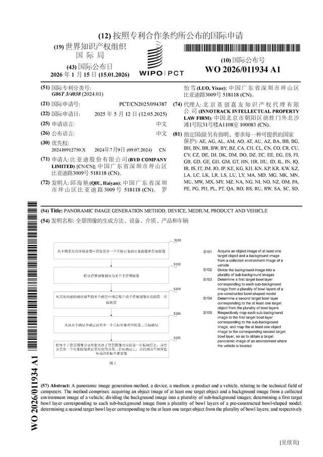 证券之星消息,根据企查查数据显示比亚迪(002594)公布了一项国际专利申请,专利名为“全景图像的生成方法、设备、介质、产品和车辆”,专利申请号为PCT/CN2025/094387,国际公布日为2026年1月15日。