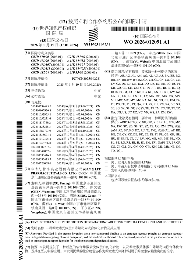 证券之星消息,根据企查查数据显示甘李药业(603087)公布了一项国际专利申请,专利名为“一种雌激素受体蛋白降解靶向嵌合体化合物及其应用”,专利申请号为PCT/CN2025/102221,国际公布日为2026年1月15日。