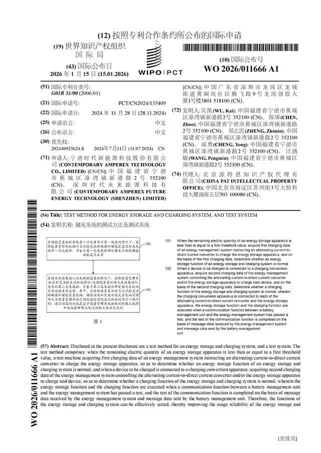 证券之星消息,根据企查查数据显示宁德时代(300750)公布了一项国际专利申请,专利名为“储充系统的测试方法及测试系统”,专利申请号为PCT/CN2024/135409,国际公布日为2026年1月15日。